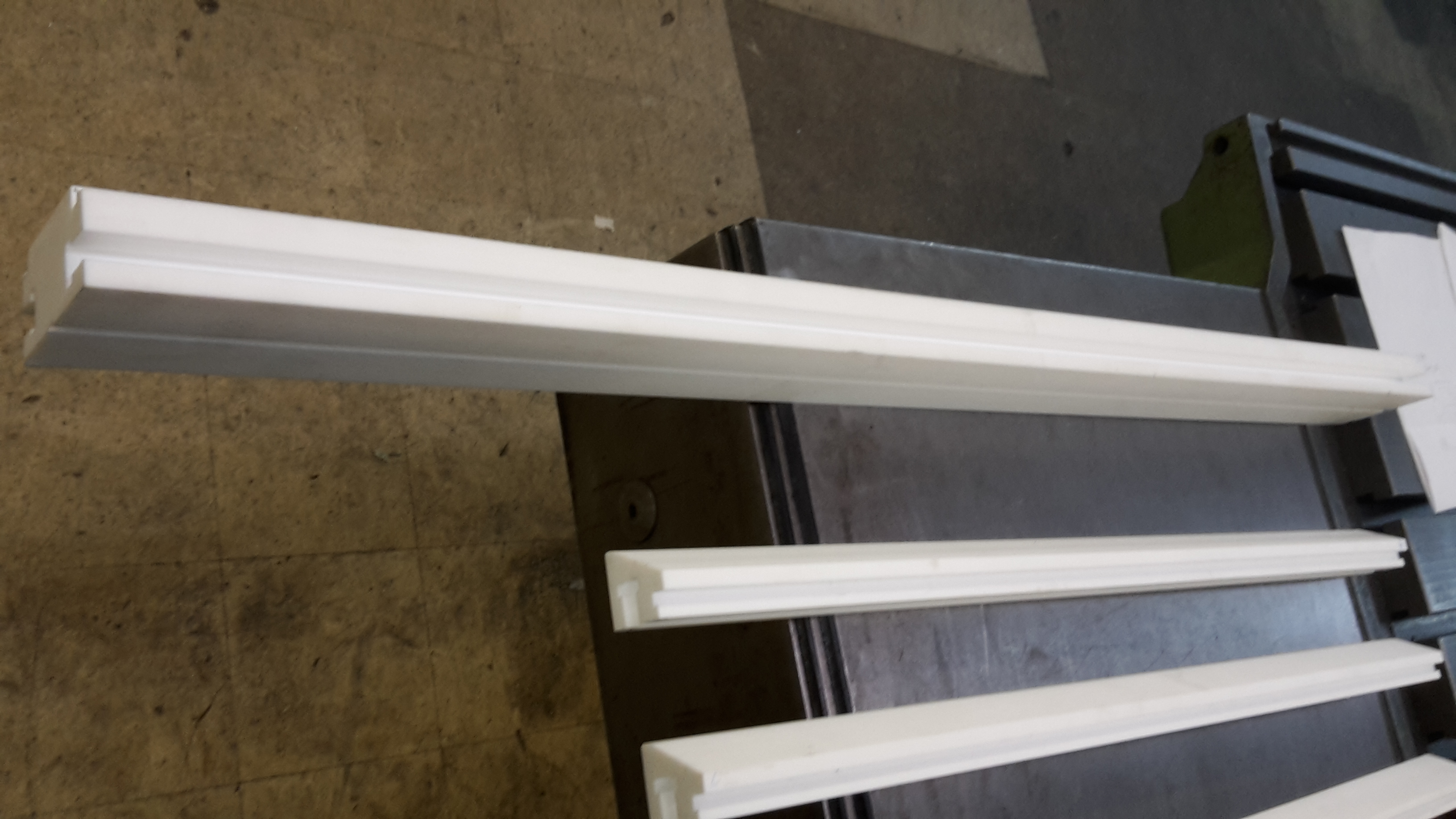 These sizing inserts for an extrusion die system are milled out of virgin Teflon. The angled sizing inserts allow material to flow out of the machine round. Then the material gets squeezed through to flatten.